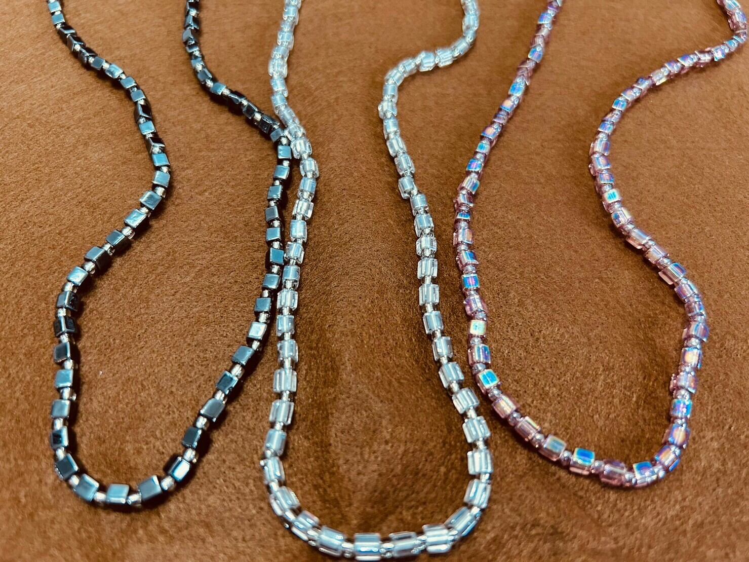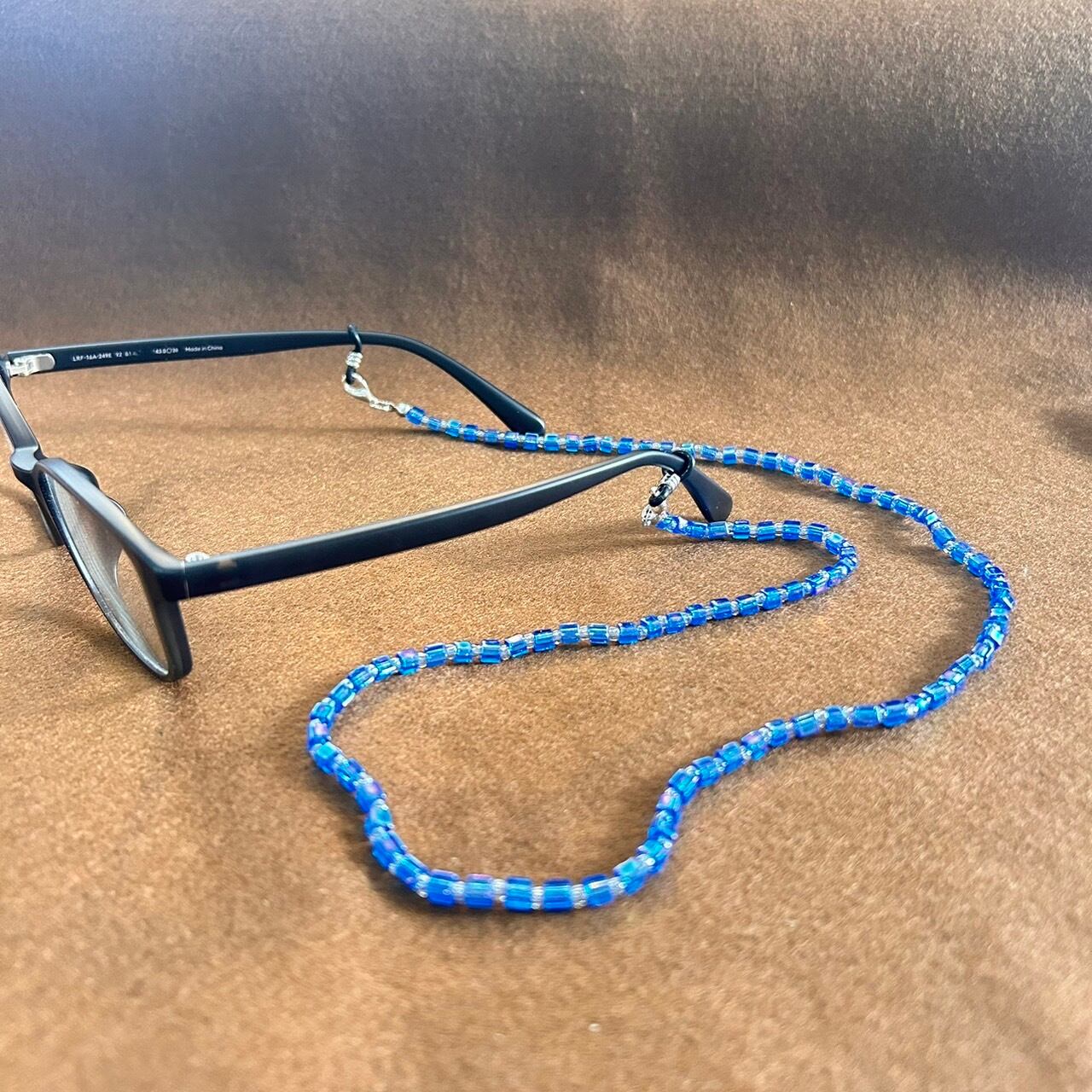 キューブビーズが際立つ、おしゃれなメガネチェーンです。シンプルなデザインながらも、キューブビーズのアクセントで一気におしゃれ度アップ!メガネをするだけでなく、ファッションアイテムとしても楽しめるチェーンです。