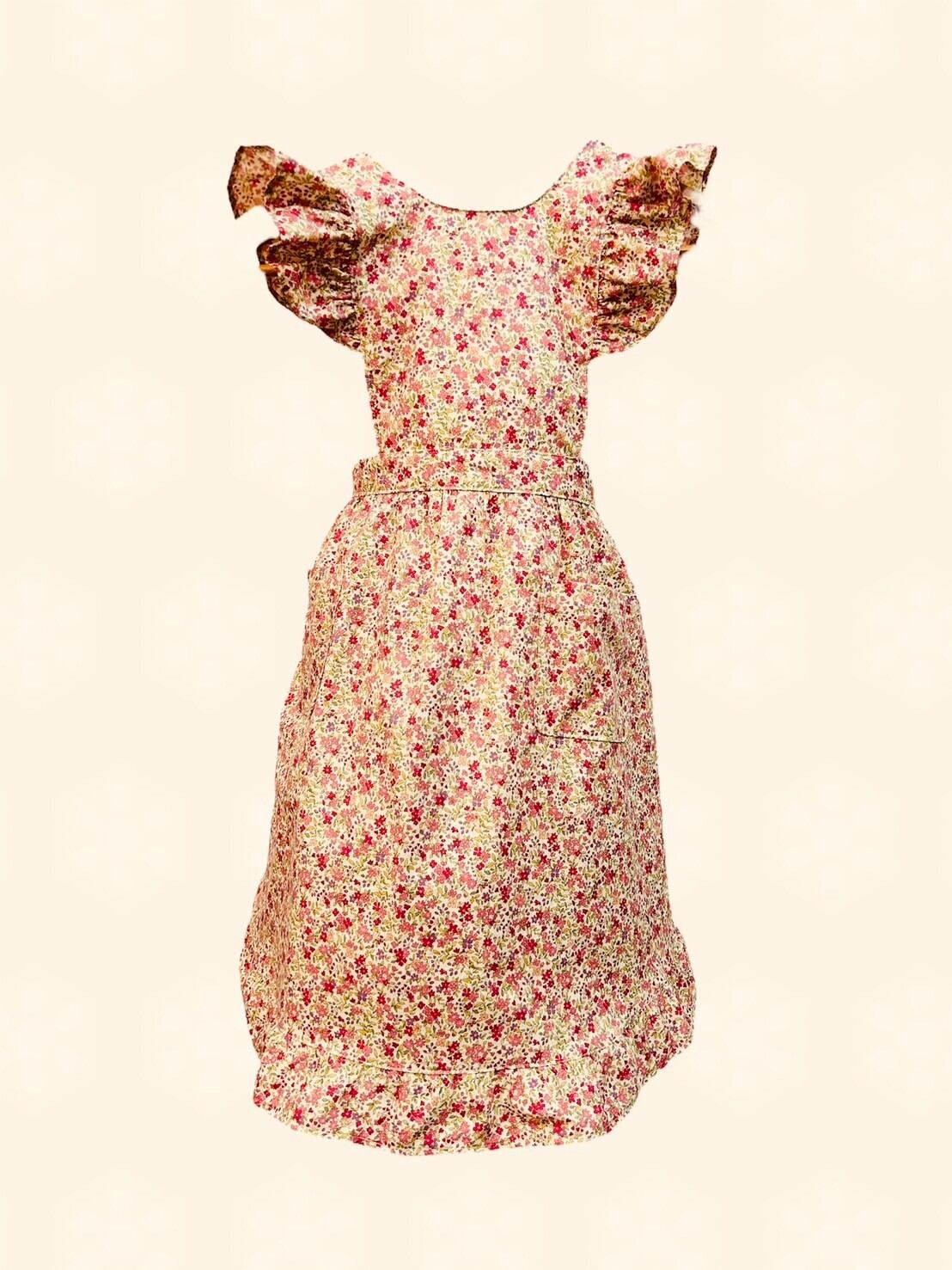 フリルエプロン(キッズ)は、可愛らしい花柄デザインが特徴の子供用エプロンです。ふんわりとしたフリルが女の子らしさを引き立て、親子で楽しいお料理の時間を演出します。手作りならではの優しい肌触りで、着心地も抜群です。